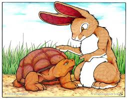 The forest animals met and mapped out the course. The race begun, and the hare, being such a swift runner, soon left the tortoise far behind. About halfway through the course, it occurred to the hare that he had plenty of time to beat the slow trodden tortoise. "Oh, my!" thought the hare, "I have plenty of time to play in the meadow here." And so he did. After the hare finished playing, he decided that he had time to take a little nap. "I have plenty of time to beat that tortoise," he thought. And he cuddle up against a tree and dozed. The tortoise, in the meantime, continued to plod on, albeit, it ever so slowly. He never stopped, but took one good step after another. The hare finally woke from his nap. "Time to get going," he thought. And off he went faster than he had ever run before! He dashed as quickly as anyone ever could up to the finish line, where he met the tortoise, who was patiently awaiting his arrival.